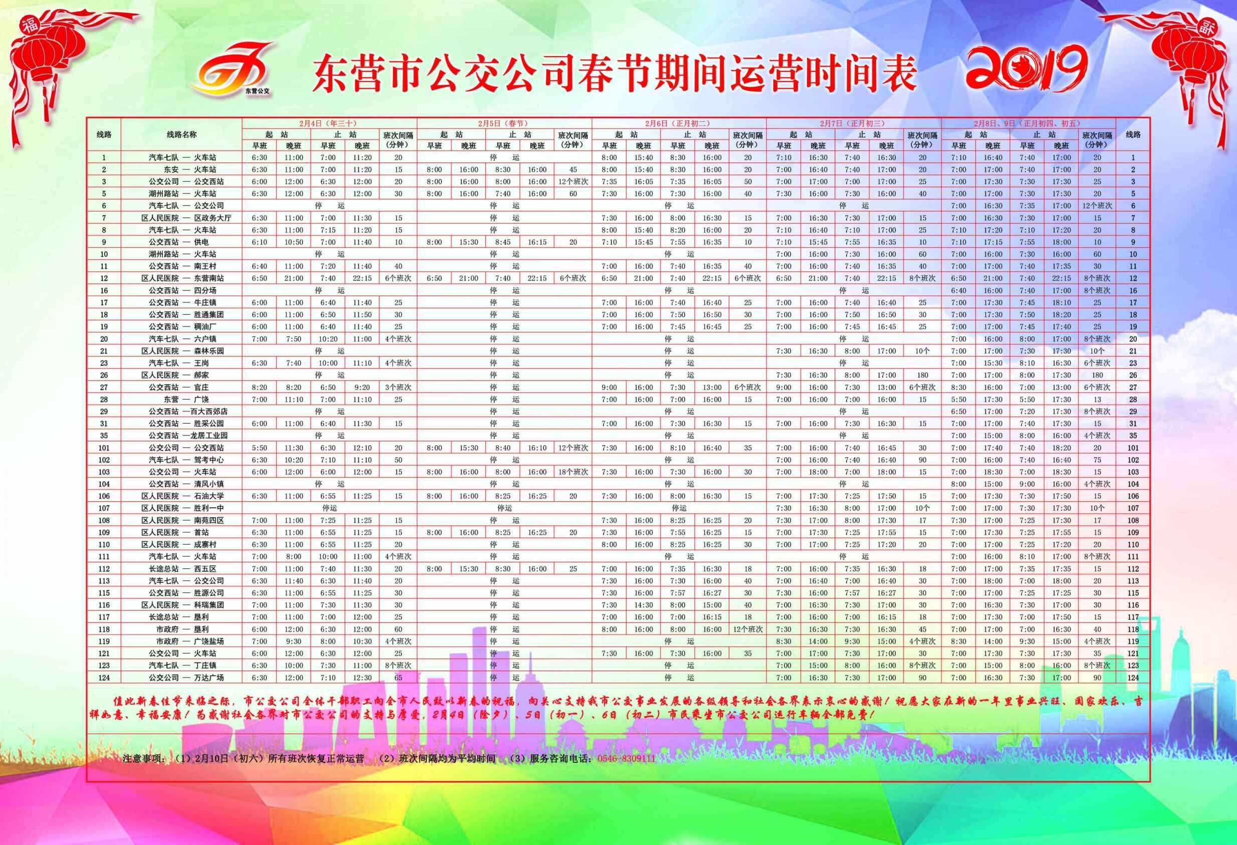 2019年東營市公交公司春節期間運營時刻表