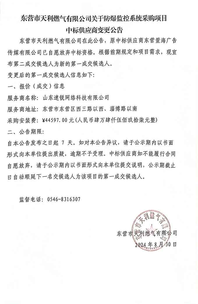 東營市天利燃氣有限公司關于防爆監控系統采購項目中標供應商變更公告