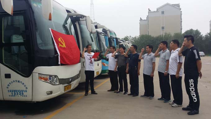 為慶祝中國共產黨建黨95周年,深化“兩學一做”主題教育活動,使全體黨員進一步牢記入黨誓言。7月1日上午,東營市公交公司汽車二隊組織全體黨員在停車場開展了重溫入黨誓詞活動。 面對黨旗,每一名黨員舉起右手,再次說出莊嚴的承諾。通過重溫入黨誓詞,使全體黨員進一步增強了黨性觀念,堅定了積極為黨工作的決心。為下一步在本職工作崗位上弘揚東營公交精神,充分發揮黨員表率作用,以實際行動履行黨員承諾,銘記黨員標準,珍惜黨員稱號,樹立黨員形象,奠定了堅實的思想基礎。