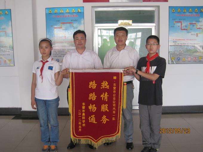 5月23日上午,市晨陽學校師生三人拿著一面寫有“熱情服務、路路暢通”的錦旗來到市公交公司汽車一隊,感謝車隊在5月17至18日為期兩天的旅游包車中,為晨陽學校兩千多名師生提供的熱情、周到、優質的服務。對近幾年公交服務質量的不斷提升表示稱贊,并向公交廣大干部職工表達深深的敬意。