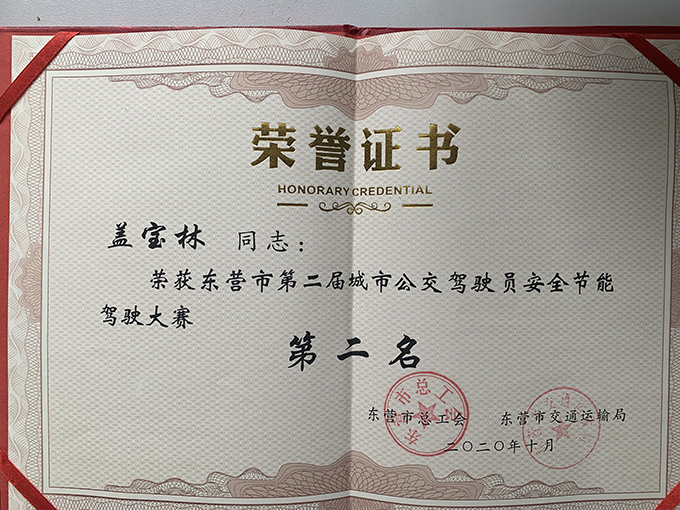 蓋寶林榮獲“東營市第二屆城市公交駕駛員安全節(jié)能駕駛大賽第二名”